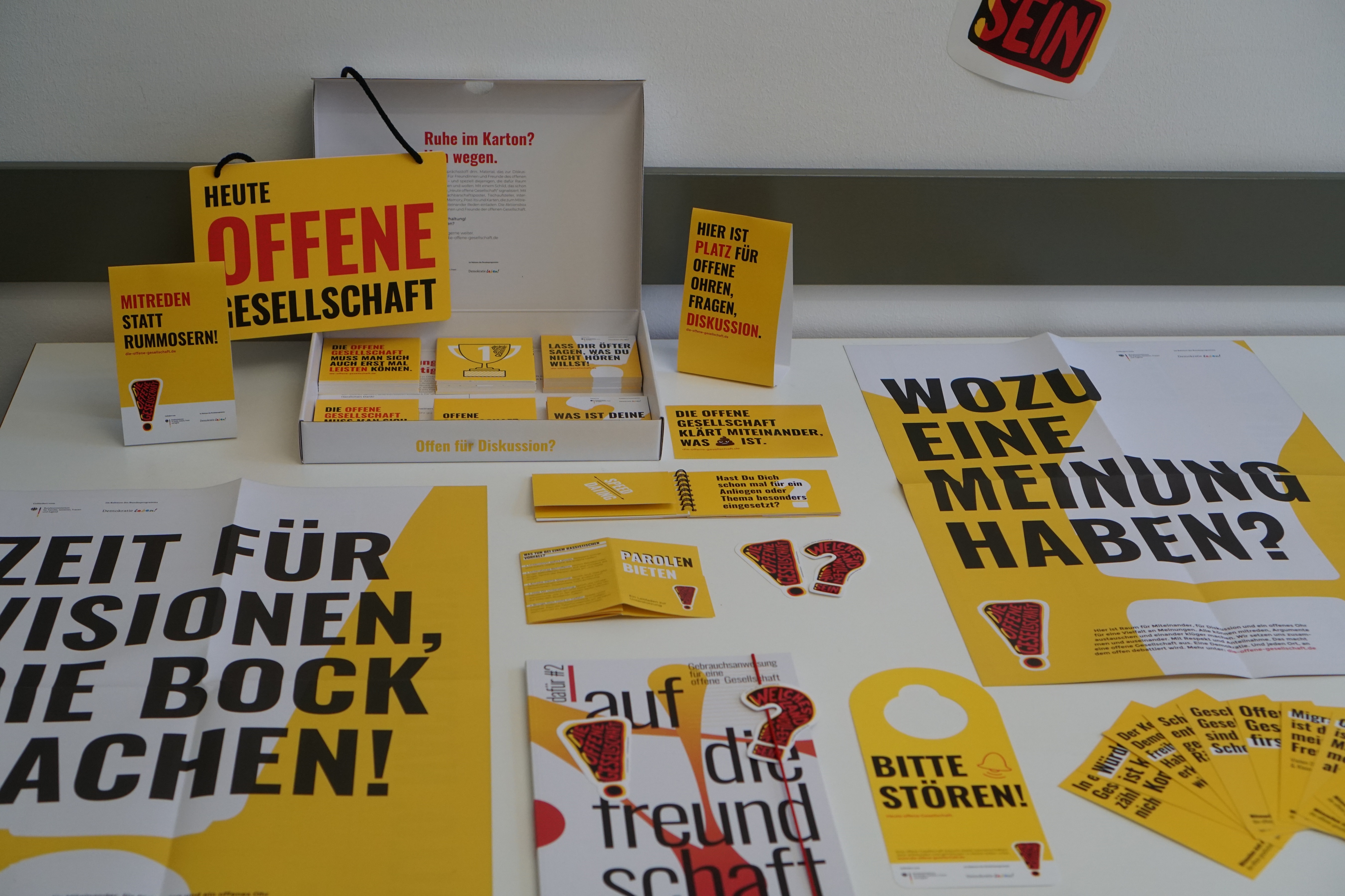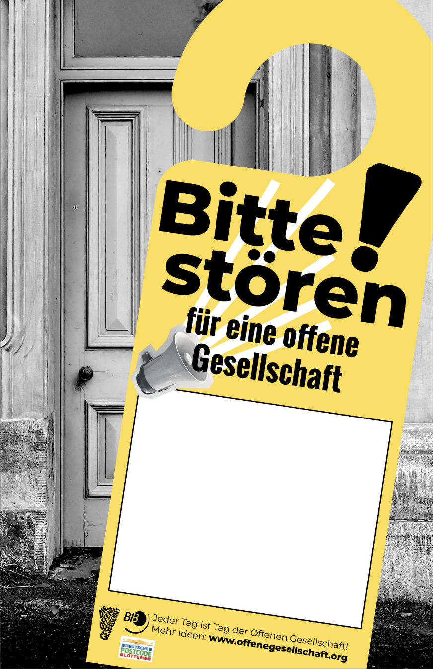 Nutze das Plakat "Bitte stören!", um für deine eigenen Aktionen Werbung zu machen. Auf der freien Fläche ist Platz für deine Veranstaltung(en) und Hinweise. Das funktioniert sowohl am Tag der Offenen Gesellschaft, aber auch zu anderen Gelegenheiten. Maximalgröße des Drucks ist DIN A2.