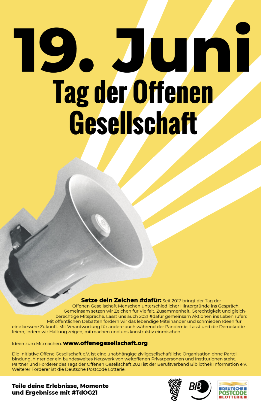 Plakat: Der Tag der Offenen Gesellshaft 2021 steht vor der Tür. Am 19. Juni ist es wieder so weit! Lass die Leute wissen, dass du dabei bist und nutze dieses Plakat, um Werbung für deine eigenen Aktionen und Veranstaltung(en) zu machen. Maximalgröße des Drucks ist DIN A2.