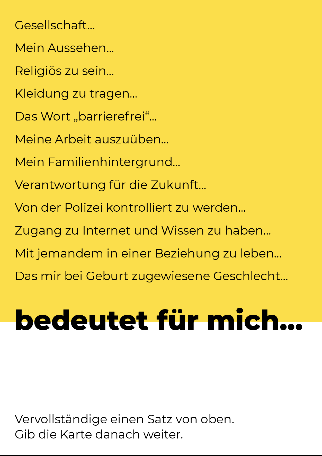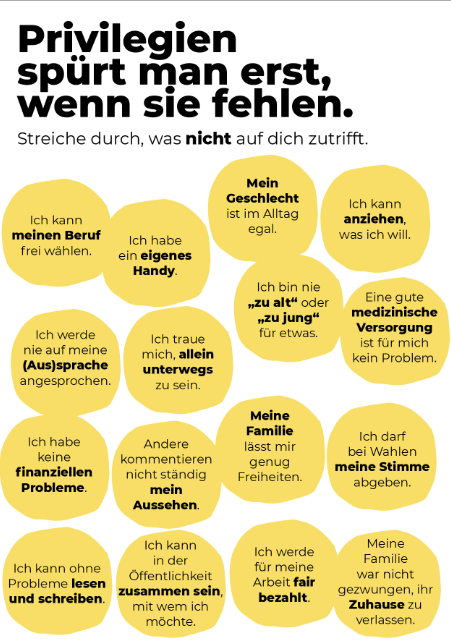 Privilegien spürt man erst, wenn sie fehlen. Oft ist uns nicht einmal bewusst, dass anderen Leuten fehlt, was selbstverständlich erscheint. Diese Postkarte zum Wegstreichen macht den Check: Was ist für dich total normal, wofür andere noch immer kämpfen müssen? Empfohlene Druckgröße ist DIN A6.