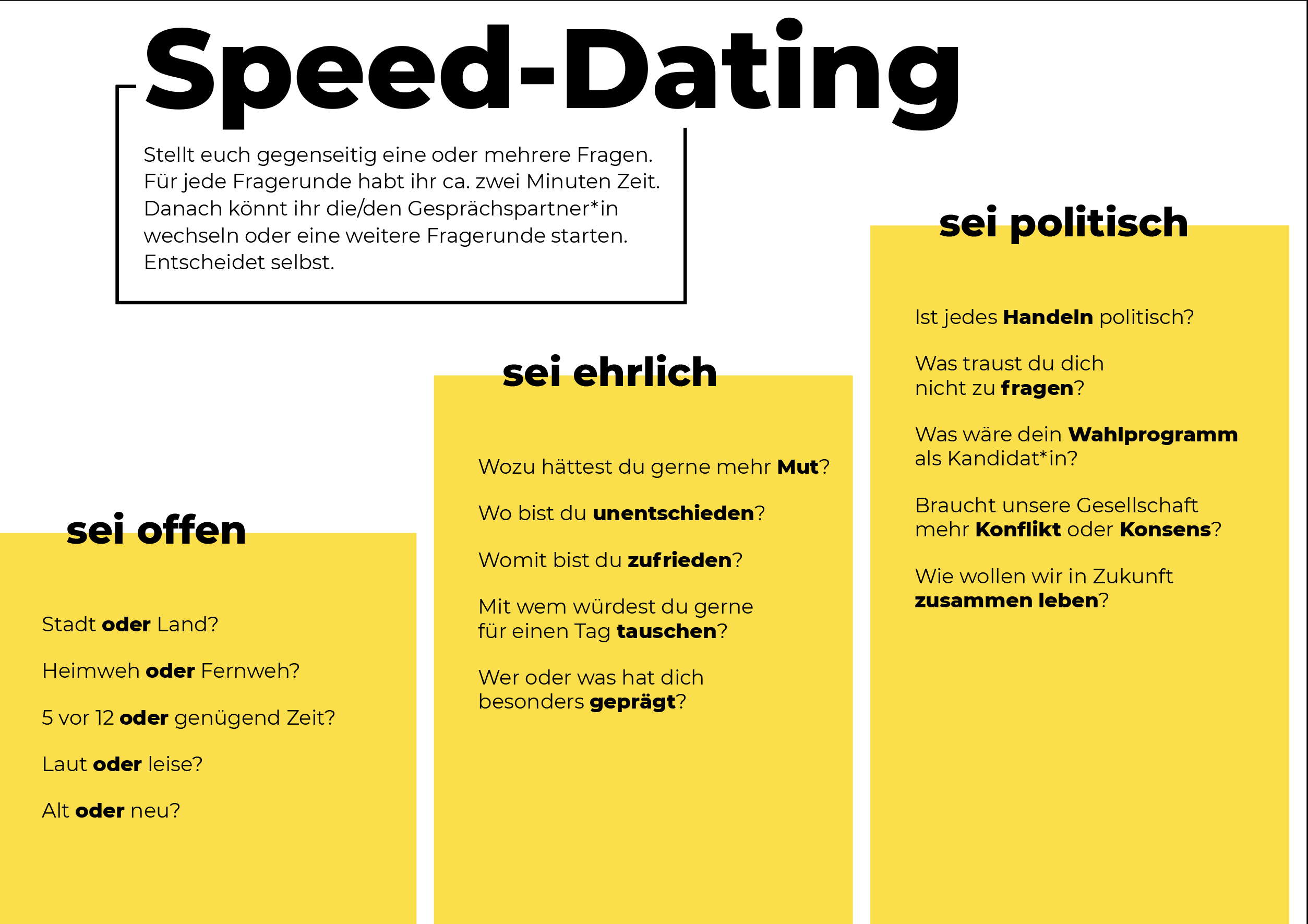 Du willst Menschen miteinander ins Gespräch bringen? Unser Speed-Dating stellt die richtigen Fragen! Stadt oder Land? Wer oder was hat dich besonders geprägt? Was wäre dein Wahlprogramm als Kandidat*in? Findet heraus, wo ihr zusammenpasst und wo ihr unterschiedlicher Meinung seid. Empfohlene Druckgröße ist DIN A4.